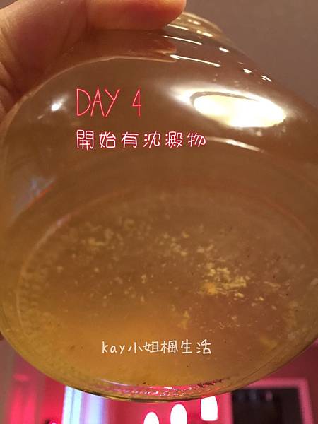。第四天 搖晃之前,檢查瓶底,發現開始有沉澱物,並且發現有吱吱聲,(同第三天)搖晃瓶子打開瓶蓋透氣。