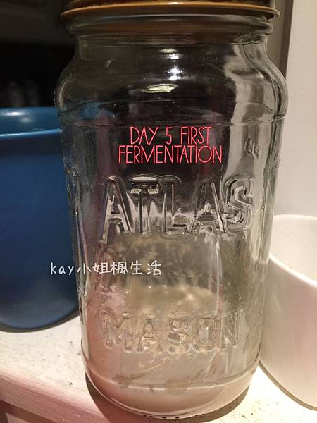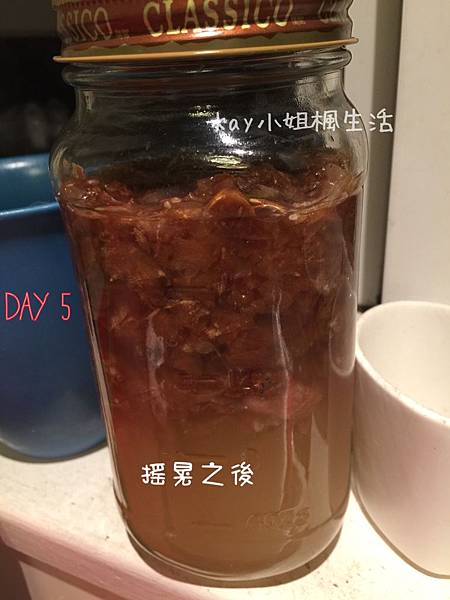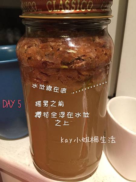 。第五天 搖晃之前,發現櫻花全部浮倒水位線之上,然後檢查瓶底,沉澱物增加,大概有瓶底一圈,然後搖晃瓶子打開瓶蓋透氣,酵母菌非常活躍,可以開始收液,濾出櫻花,留下酵液養酵種。