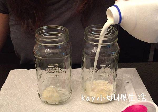 1️⃣將1大匙奶克菲爾菌放入已消毒的乾淨玻璃瓶內,加入750CC左右的牛奶,放置在室溫20-26C下18-24小時,直到表面有凝固狀,就可以倒出牛奶濾出母菌,進行下一次餵養。