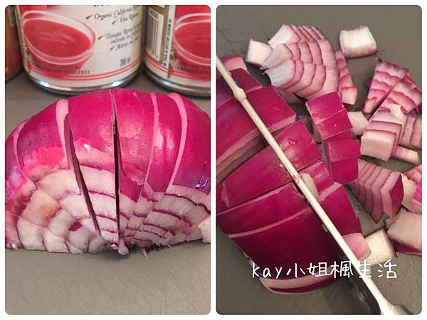 ⭐️切洋蔥小撇步:洋蔥切半,先做放射狀切割,再切丁。