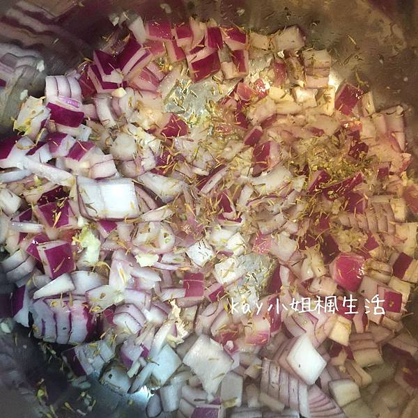 。中大火,鍋內放入1大匙橄欖油,炒香大蒜和洋蔥,加入百里香和奧勒岡葉。