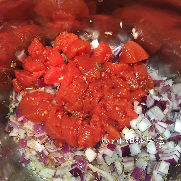 。將原粒番茄取出切丁,罐內的醬汁不要丟掉,放置一旁備用。