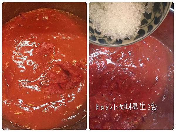 。除番茄膏外,倒入所有的番茄醬(包括原粒番茄的醬汁),拌勻煮沸(到有開始冒泡)。