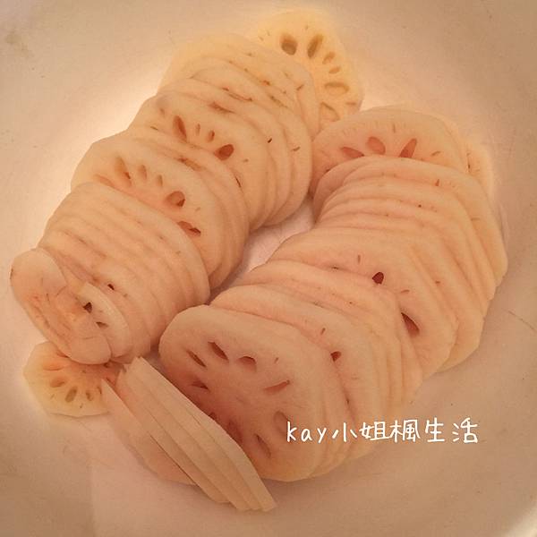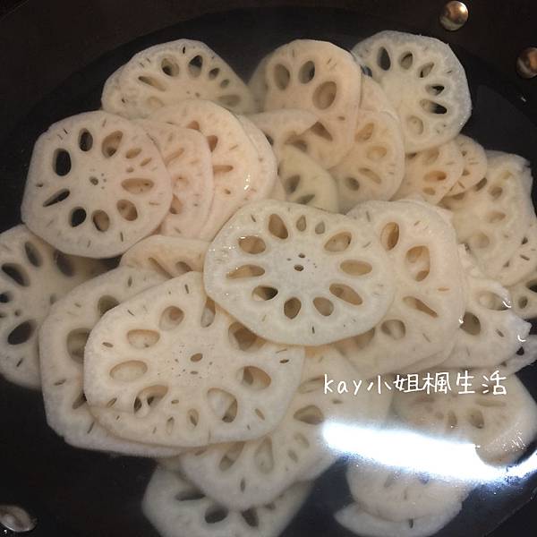 。燒一鍋水,水燒開後,放入藕片過水1-2分鐘,撈起備用。(過水不用等到水滾再撈起
