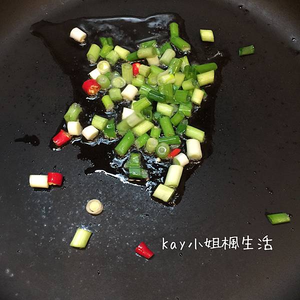 。中大火熱鍋,鍋內放2大匙油,再放入蔥末和辣椒末炒香。