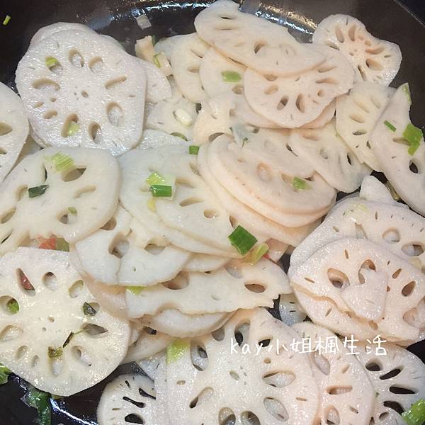 。蓮藕去皮切薄片,約5mm左右。青蔥切末,小紅辣椒切末。